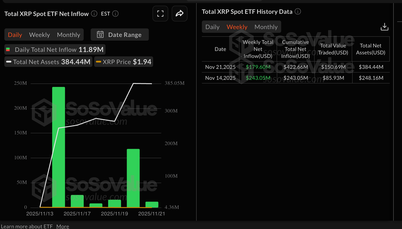 在美国上市的XRP ETF首周表现强劲,资金流入近1800亿美元,前一周流入2.43亿美元。SoSoValue数据显示,这些加密货币产品可以直接通过以下方式访问:库存截至 11 月 21 日,交易所累计净流入总额约为 4.23 亿美元,净资产为 3.84 亿美元。