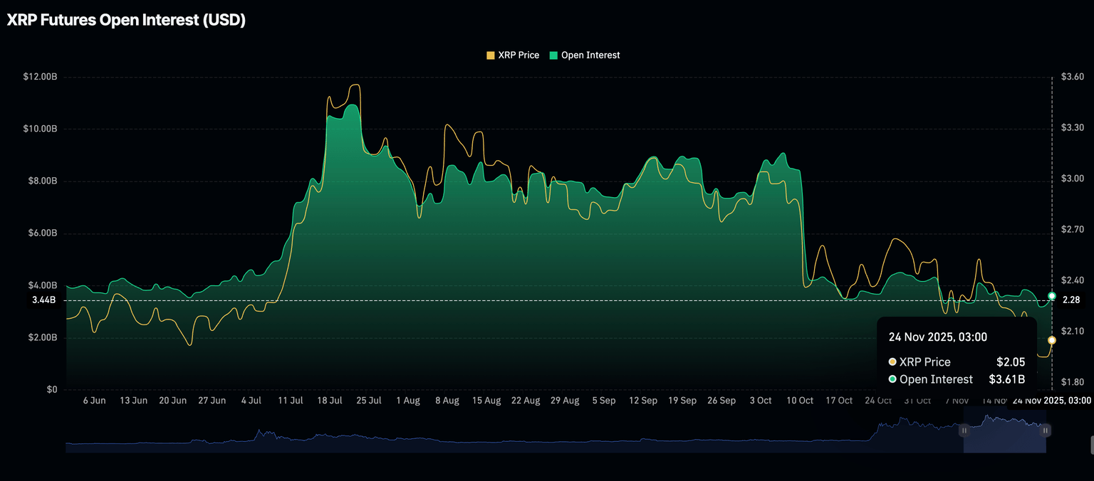 截至周一发稿时,XRP交易价格约为2.06美元,日线图上的相对强弱指数(RSI)呈上升趋势,为其提供了支撑。RSI目前为39且持续上升,表明看涨势头正在增强,交易者正将仓位设在关键的2.00美元关口上方。