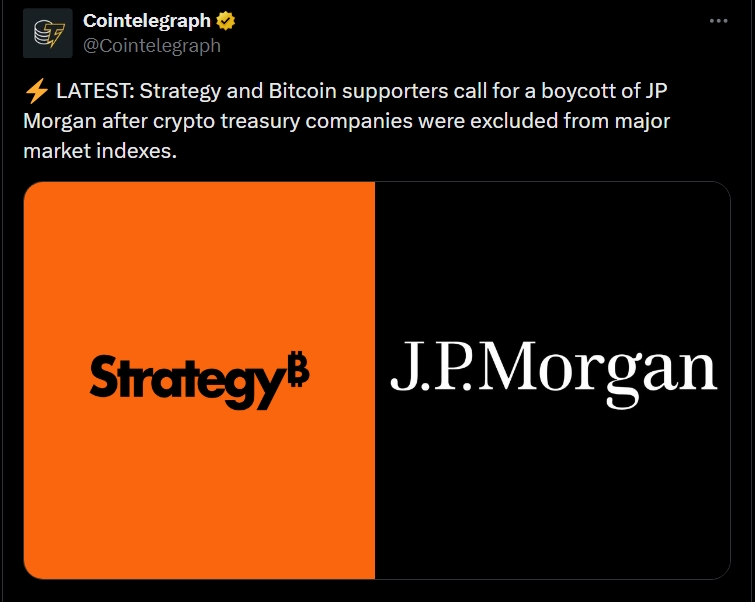 加密货币社区正在积极推动……摩根大通将比特币排除在其最新指数更新之外后,引发了对偏见、透明度以及对数字资产市场更广泛影响的担忧,进而引发了比特币抵制运动。
