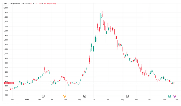Metaplanet股价上涨2.24%,至365日元。不过,目前股价仍比6月份的历史高点低80%以上。