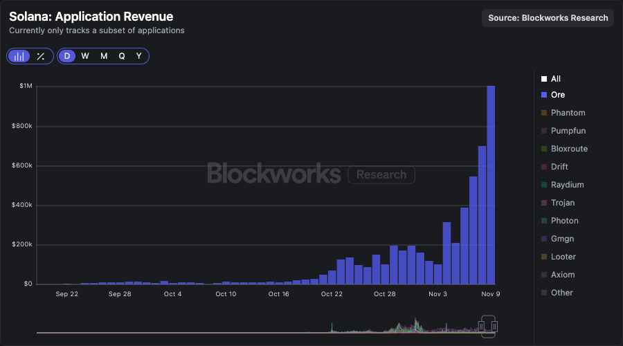 Ore 在过去 24 小时内创造了超过 100 万美元的收入,成为 Solana 上同期收入第二高的应用程序——仅次于 pump.fun。