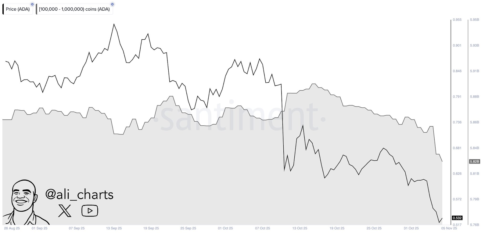 Cardano 的价格已重新测试并从 0.55 美元附近的支撑位反弹。自 2024 年以来,该区域一直扮演着关键支撑的角色,尽管价格偶尔会跌破该区域后又反弹。因此,如果 ADA 价格在未来几周内继续保持在当前流动性水平之上,那么关于其价格即将迎来抛物线式上涨的说法将得到证实。