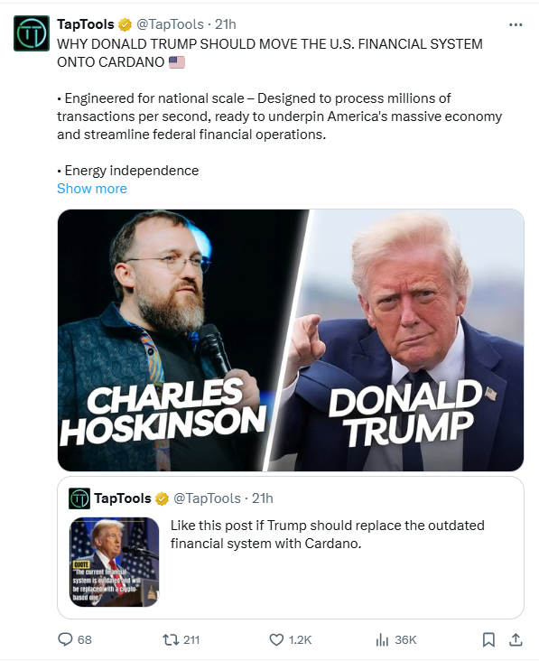 该帖子暗示,唐纳德·特朗普可能会将 Cardano 视为未来美国金融网络的基础。