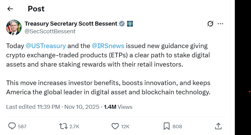 美国财政部和国税局为交易所交易产品(ETP)以及寻求区块链实际收益的美国加密货币投资者带来了一项突破性进展。11月10日,财政部长斯科特·贝森特办公室宣布了新规,允许用户质押数字资产并与散户投资者分享奖励。