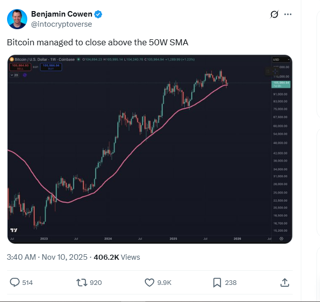 在图表上,比特币价格走势依然保持上涨势头。该股刚刚收于50周简单移动平均线之上——这条长期趋势线自2023年初以来从未向下跌破。