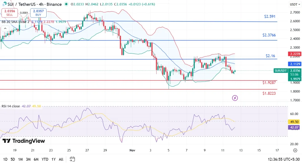 在分析 Sui 加密货币价格图表时,以下几点引起了我的注意。瑞士价格SUI跌破2.07美元的关键支撑位和2.08美元的7日均线,表明多头失去控制,股价明显疲软。RSI-14指标为42.07,显示SUI正从超卖水平反弹。