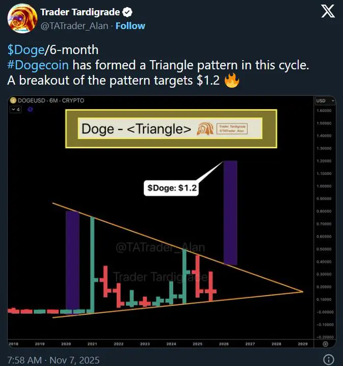 然而,知名交易员Tardigrade认为狗狗币的下跌趋势很快就会结束。根据他的说法,他的 X 帖子这种网络迷因币在本轮周期中形成了一个三角形形态。这可能导致狗狗币价格上涨至 1.2 美元水平。