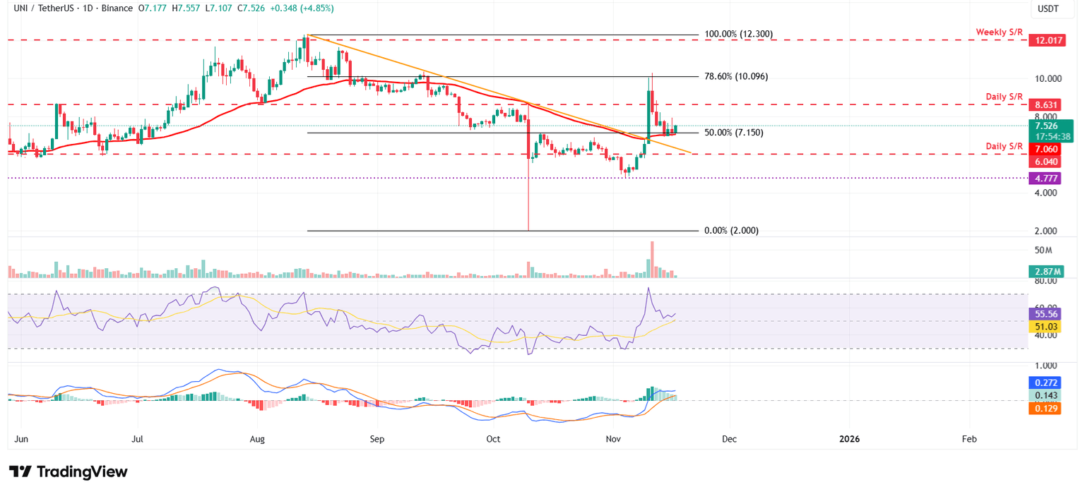 另一方面,如果UNI收盘价低于7.06美元,则可能会继续下跌至6.04美元的日支撑位。