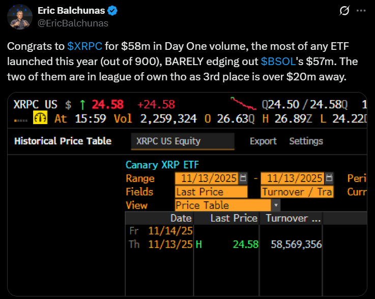 巨大的交易量意味着 XRPC 成为今年所有新推出的现货加密货币 ETF 中首发规模最大的一只。