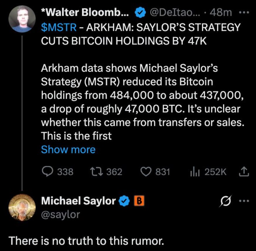 Arkham 的数据显示,该公司持有的比特币数量从 48.4 万枚减少到约 43.7 万枚。Saylor 在社交媒体上回应了相关报道,并明确否认了这一说法。