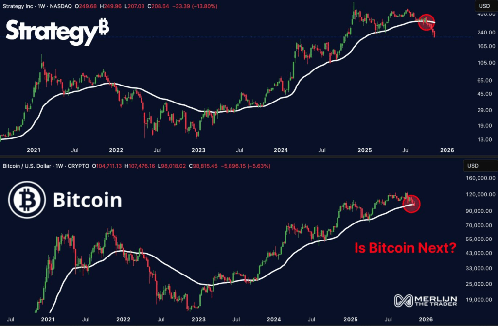 在此背景下,分析师 Merlijn The Trader 警告称,MSTR 正处于危险区域,200 美元是其主要支撑位。如果比特币价格跌至 9 万美元,MSTR 可能面临巨大压力。