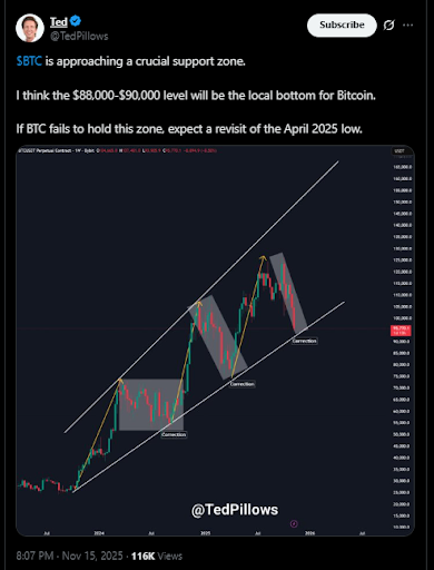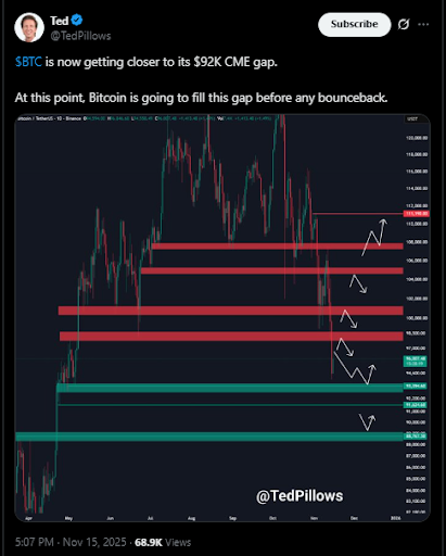 除了期货缺口之外,分析师们还关注着大约在 88,000 美元至 90,000 美元之间的更宽的支撑区间。对许多人来说,如果期货引发的抛售持续下去,该区域将是下一个目标价位。