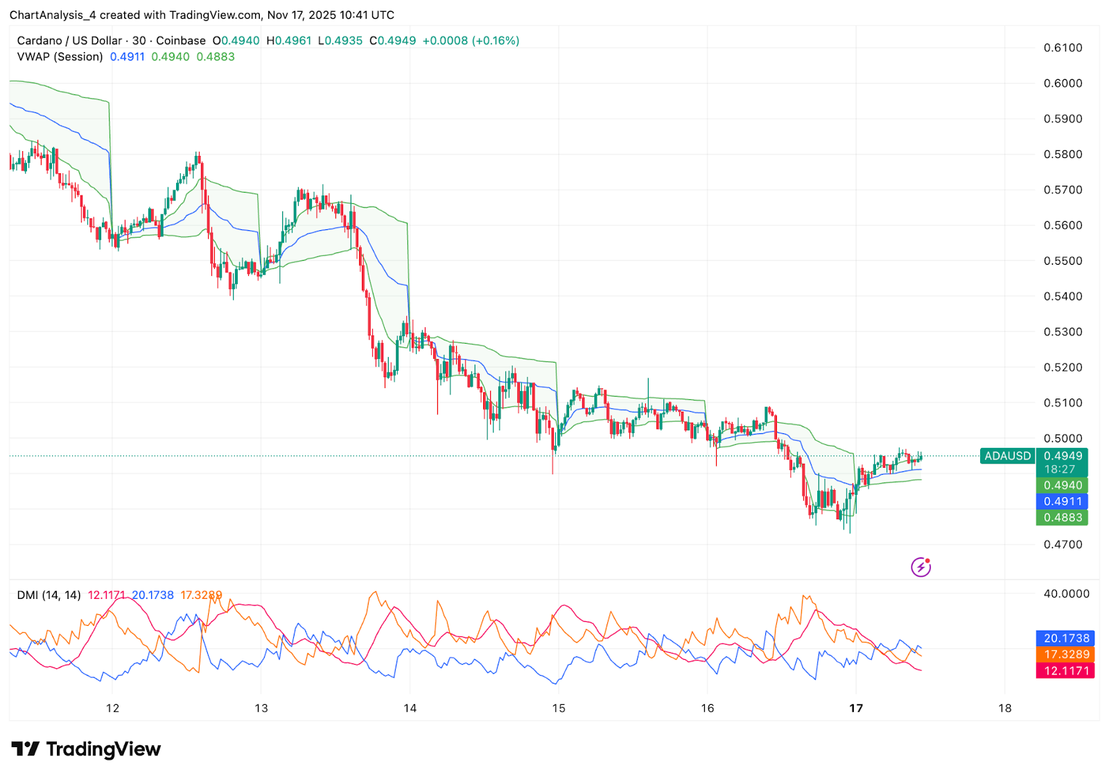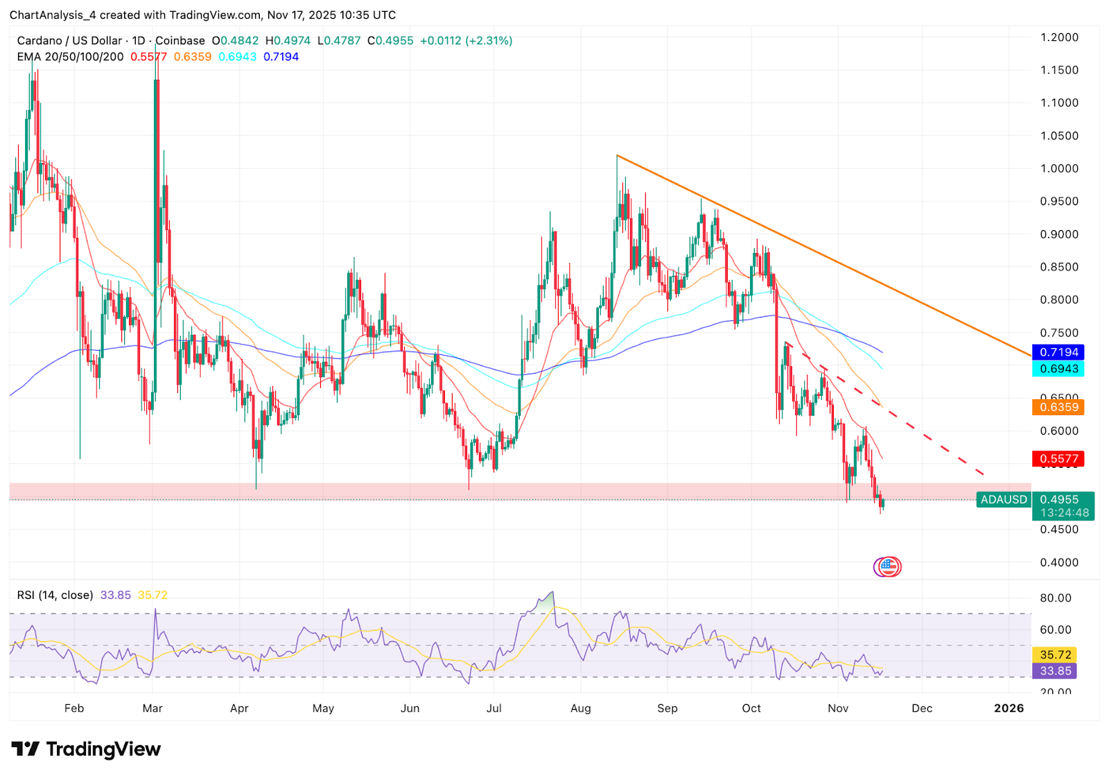 卡尔达诺 (Cardano) 价格今日在 0.495 美元附近交易,市场在经历了数周的下跌后试图企稳。卖方持续施压,导致价格走低,而 ADA 则徘徊在其最重要的支撑区域之一——2025 美元上方。近期 ETF 纳入计划的消息引发了市场关注,但由于技术面压力依然占据主导地位,价格尚未反映出这一利好因素。