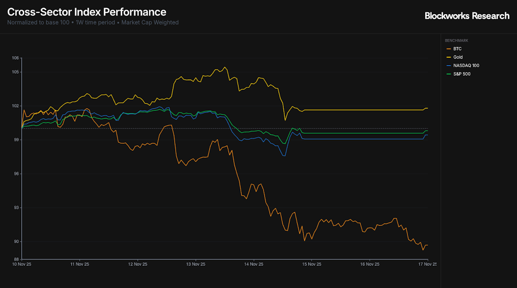 美国历史上持续时间最长的政府停摆结束后,市场仍未完全复苏。尽管黄金表现优异(过去一周上涨1.79%),标普500指数和纳斯达克100指数也仅小幅下跌(分别下跌0.21%和0.57%),但比特币却遭遇了大幅下跌,过去七天下跌了10.32%。