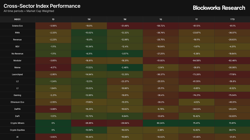 山寨币的表现同样不佳。唯一跑赢比特币的板块是RWA和无收益代币。无收益代币表现略好,主要是因为XRP的表现优于比特币(过去一周仅下跌6.36%);RWA代币则主要得益于OUSG(上涨0.73%)和HASH(下跌3.44%)在过去一周的支撑。