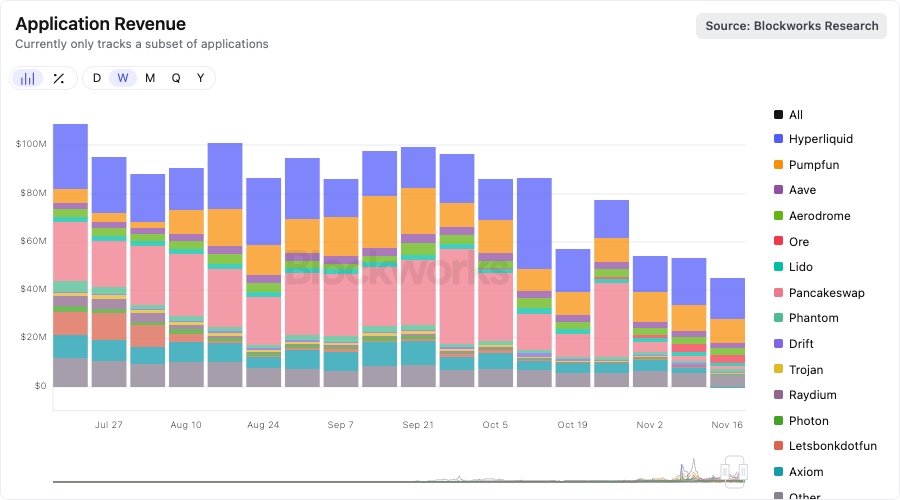 Hyperliquid 继续领跑应用收入榜,上周收入达 1710 万美元,紧随其后的是 Pump.fun,收入为 960 万美元。尽管基于这些收入数据,Pump.fun 的市盈率较低,但其代币表现却逊于 HYPE。PUMP/HYPE 交易对上周下跌了 23.4%。