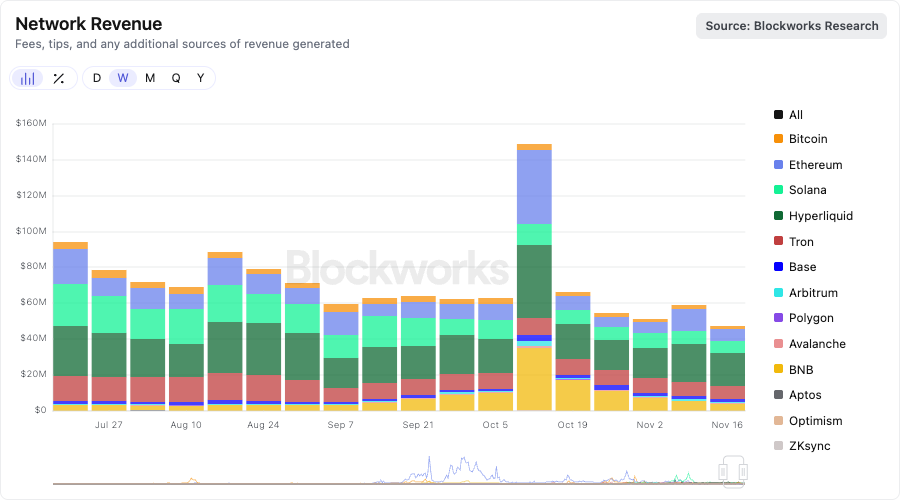 就链上收入而言,尽管模因币(除了pump.fun之外)活动持续低迷,Solana的表现却出人意料地好。过去两个月,Solana的收入市场份额从所有链的21%下降到12%。尽管如此,该链的收入仍然高于以太坊,但目前落后于Hyperliquid和Tron。