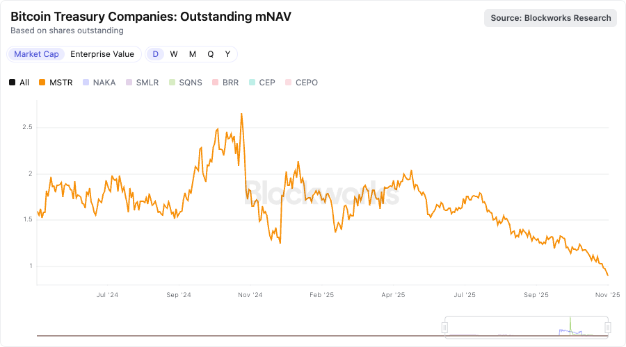 MSTR 的未平仓净资产值 (mNAV) 已降至 0.9。今天早些时候,Saylor 宣布 MSTR 以约 102,171 美元/枚的价格购入了 8,178 枚比特币,总价值约 8.356 亿美元。尽管 Saylor 不太可能出售,但净资产值低于 1 会使发行变得越来越困难,导致购买量减少,并可能进一步降低净资产值。