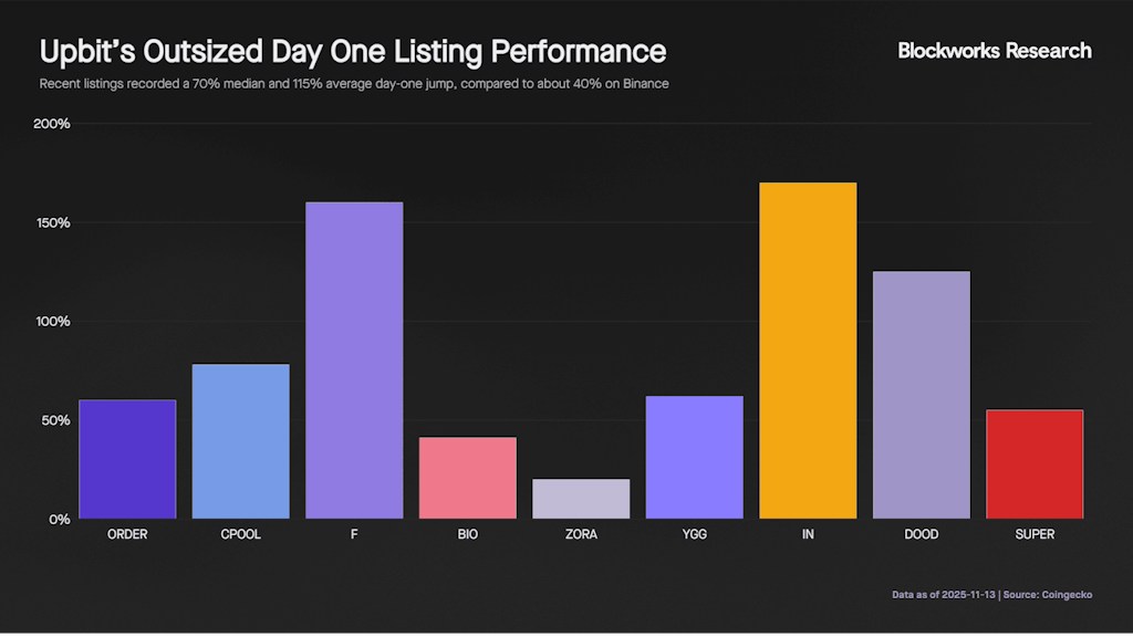 在最近Upbit 10上线的币种中,上线首日价格涨幅中位数为70%,平均涨幅为115%,而币安上非热门币种的涨幅约为40%——这反映了韩国散户投资者群体的高度活跃,他们对新资产的热情往往会推动短期价格飙升(详见下文)。更多的)。