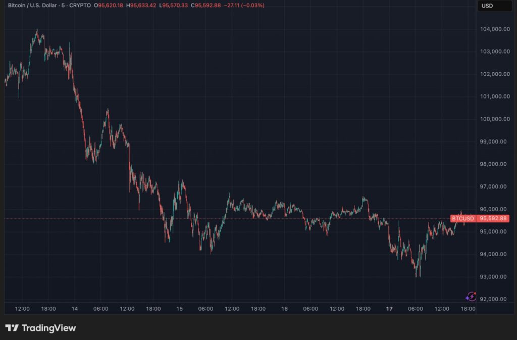 上周交易价格为 107,476 美元的比特币,周五暴跌至 94,000 美元,周日进一步下滑至 93,000 美元以下,到周一仅略微反弹至 95,592 美元。