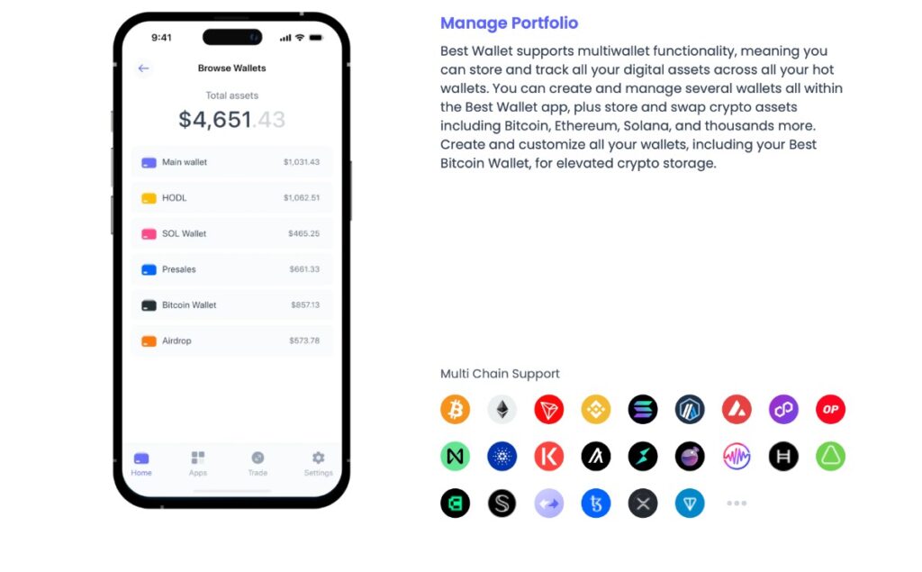 多链资产的处理方式同样简便。来自不同网络的钱包可以导入并并排查看,从而整合原本分散在各个应用程序中的数据。为了进一步完善这一功能,Best Wallet 正准备推出一套投资组合管理套件,该套件配备高级分析功能,用于跟踪持仓和业绩趋势。