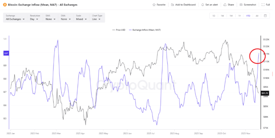 截至周二发稿时,比特币 (BTC) 价格跌破 9 万美元,延续了上周大幅下跌后的持续回调。机构需求也支撑了看跌观点,美国上市的现货比特币交易所交易基金 (ETF) 周一录得 2.5454 亿美元的资金流出,延续了持续的赎回浪潮。链上指标进一步佐证了看跌观点,交易所储备增加、充值量增长以及净交易流量上升均表明卖方压力增大。