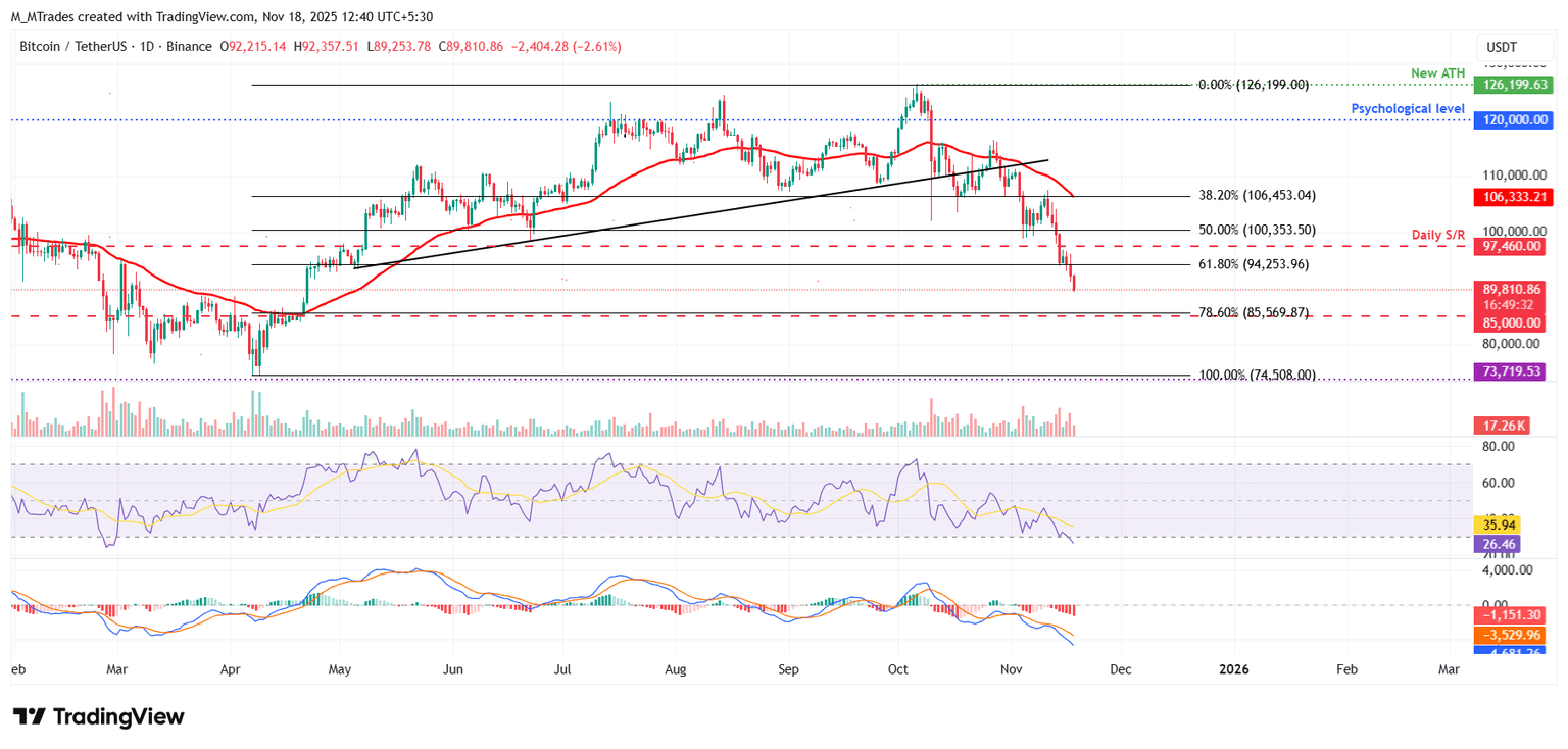 比特币价格上周,比特币在 106,453 美元的 38.20% 斐波那契回撤位(该回撤位由 4 月 7 日的低点 74,508 美元和 10 月 6 日创下的历史高点 126,299 美元构成)遭遇阻力,下跌近 10%。周一,比特币继续下跌,收于关键支撑位 94,253 美元下方。截至周二发稿时,比特币跌势延续,交易价格跌破 90,000 美元。