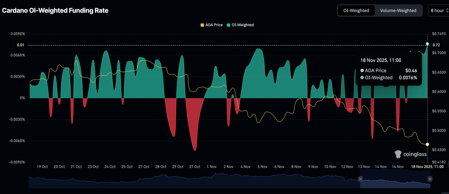 未平仓合约加权融资率已升至0.0076%,表明市场风险偏好有所上升。随着交易员大量买入ADA的多头头寸,该指标走高,支撑了积极的市场情绪。更高的读数支持短期至中期内的稳步复苏。