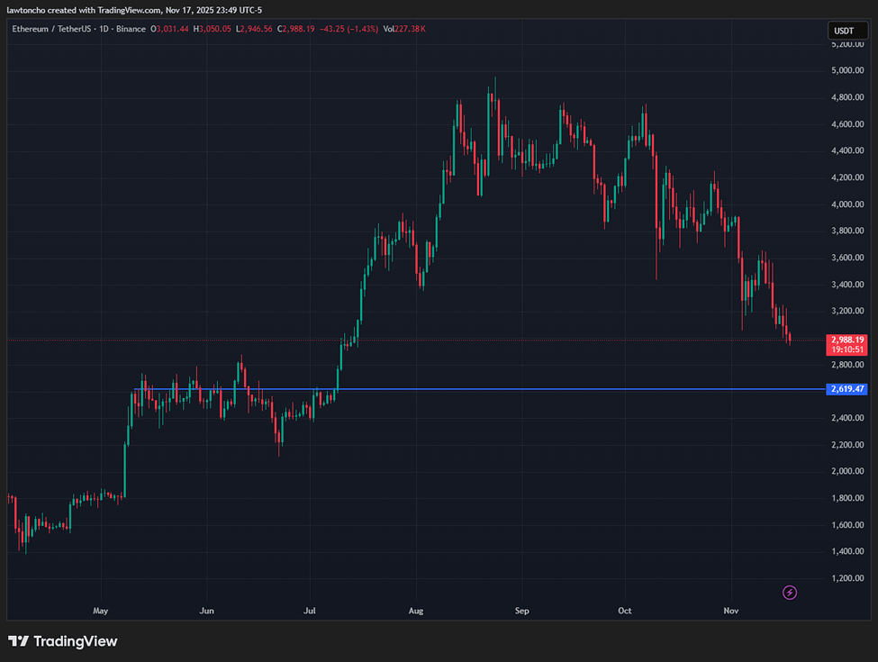 加密货币市场近期承受着巨大压力,以太坊 (ETH) 已跌破 3000 美元大关。眼看着散户纷纷抛售,我则专注于从技术角度出发,尤其是对于长期持仓而言,那些对我至关重要的关键价位。我的交易策略始终以耐心和自律为核心,即使市场波动加剧,这一点也不会改变。我不会受情绪左右,而是会回到图表前,确定我的目标价位,并做好准备,等待机会的到来。
