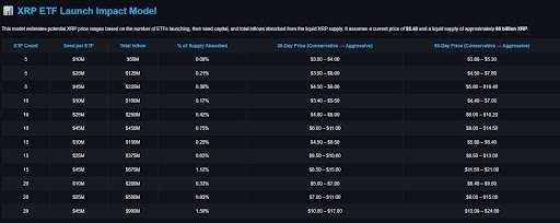 戴安娜的新发布“XRP ETF发行影响模型”清晰地阐述了仅凭ETF资金流入如何重塑XRP价格,并以数据为依据构建了模型。该模型测试了多种发行方案,涉及5至20只ETF,每只ETF的初始资金为1000万美元至4500万美元。根据规模大小,总资金流入量在5000万美元至9亿美元之间,相当于XRP约600亿单位流动供应量的0.08%至1.50%。