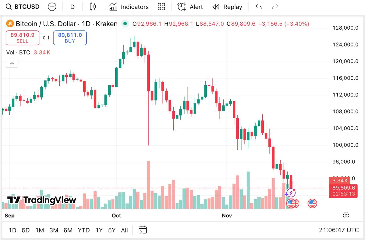 比特币目前继续稳固着整体市场情绪,仍然是机构投资者和大型加密货币投资者的重要参考指标。其当前交易价格约为 9 万美元,较上年同期下跌 4.15%。