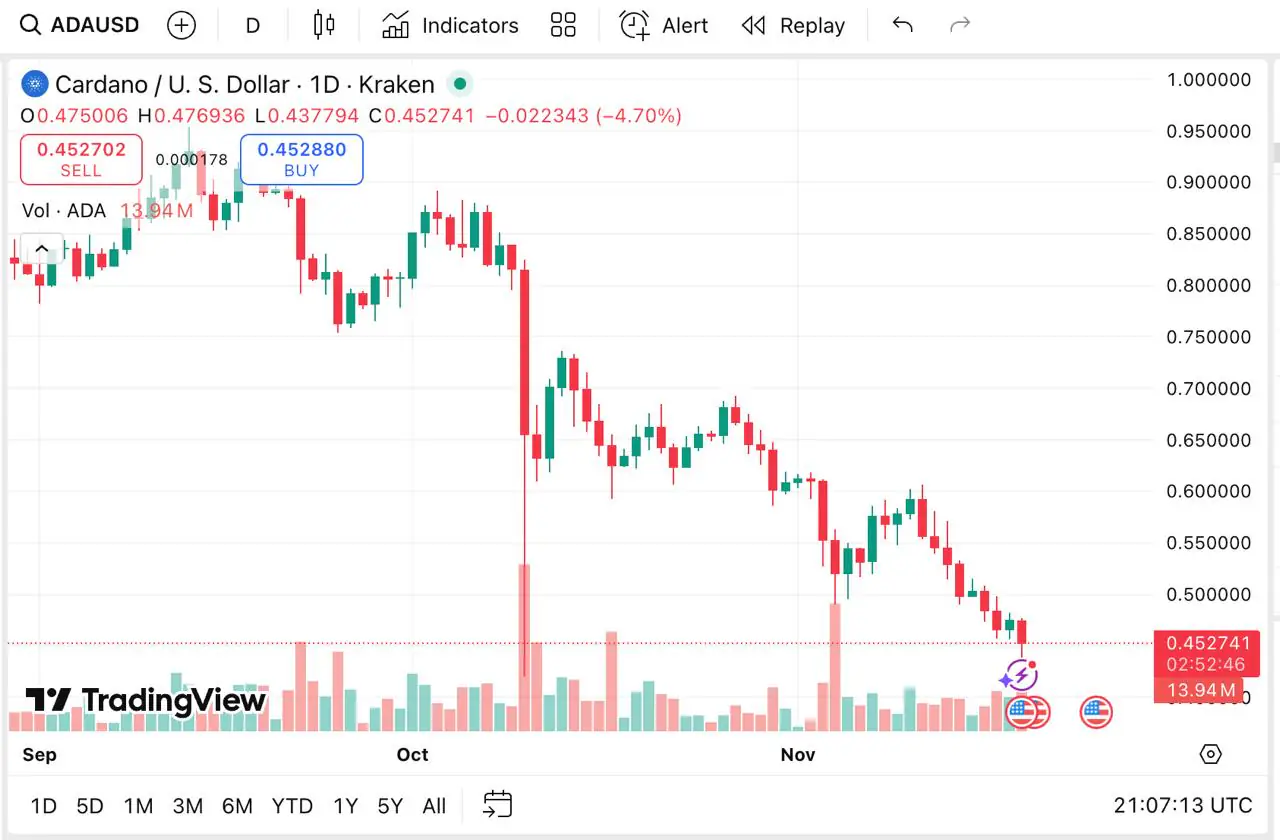 Cardano 目前售价为 0.45 美元,当日下跌 5.99%。其市值为 162.2 亿美元,日交易量仍保持在 8.4792 亿美元的健康水平,尽管后者较前一日下降了 34.82%。