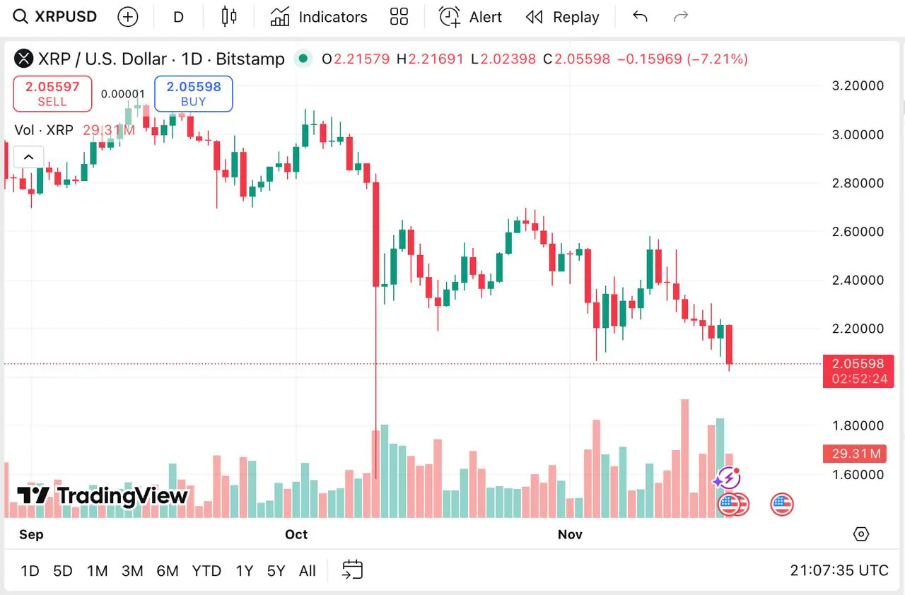 XRP 目前售价约为 2.1 美元,跌幅约为 6.53%。其市值接近 1255.3 亿美元,而交易量约为 45.8 亿美元,下降了 34.81%。
