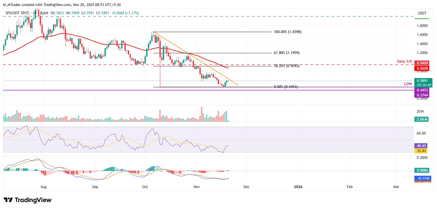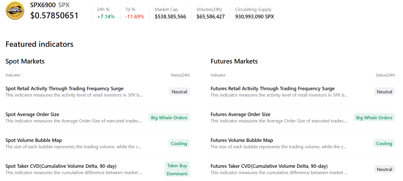 截至周四发稿时,SPX6900 (SPX) 价格稳定在 0.58 美元附近,此前该指数在本周早些时候从关键支撑区域反弹。链上和衍生品数据显示市场状况走强,交易量上升,巨鲸活动增多,资金流入为正。利率这表明上涨势头再度增强。与此同时,技术指标也显示空头压力正在减弱,支持标普500指数可能进一步反弹。