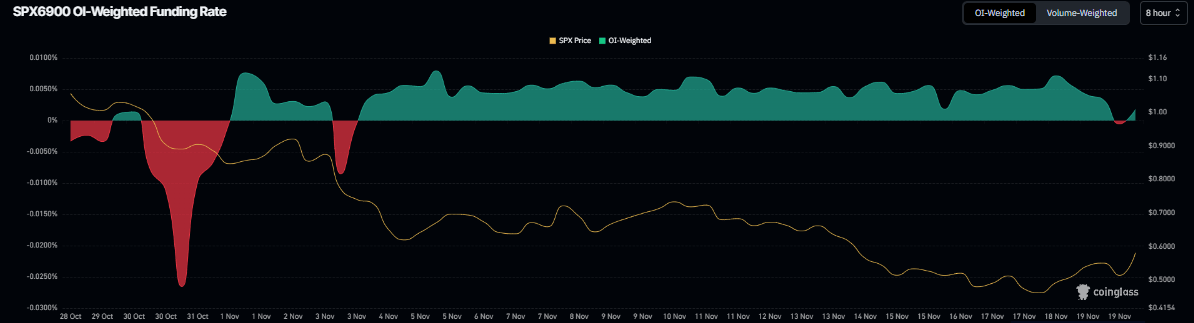 衍生品数据也支持标普500指数(SPX6900)的反弹行情,Coinglass的未平仓合约加权融资率数据显示,押注标普500指数价格将进一步下跌的交易员数量低于预期价格上涨的交易员数量。