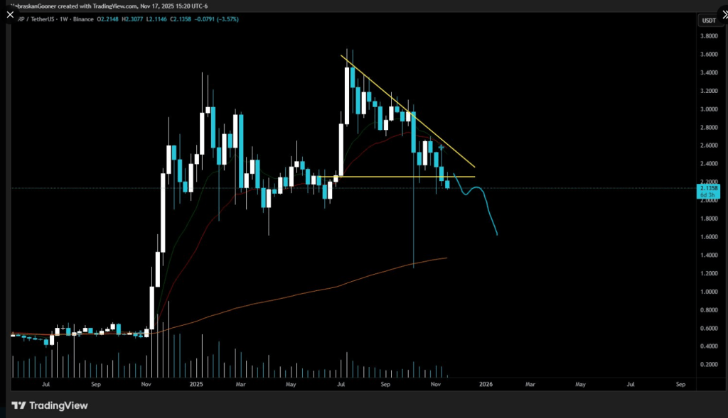 市场技术分析师警告称,价格可能下跌。分析师 Nebraskangooner 指出,价格未能突破下降三角形形态,并将目标价位设定在 1.50 美元附近——较近期 2.15 美元的交易水平下跌约 30%。