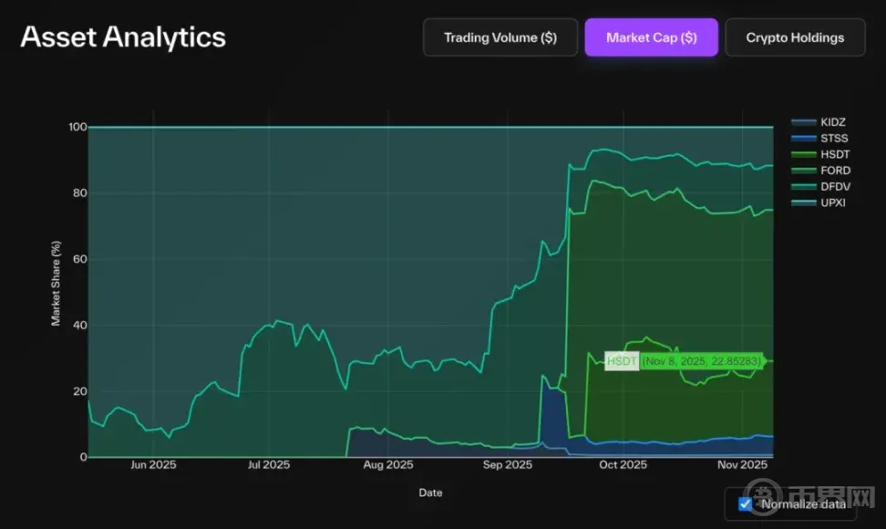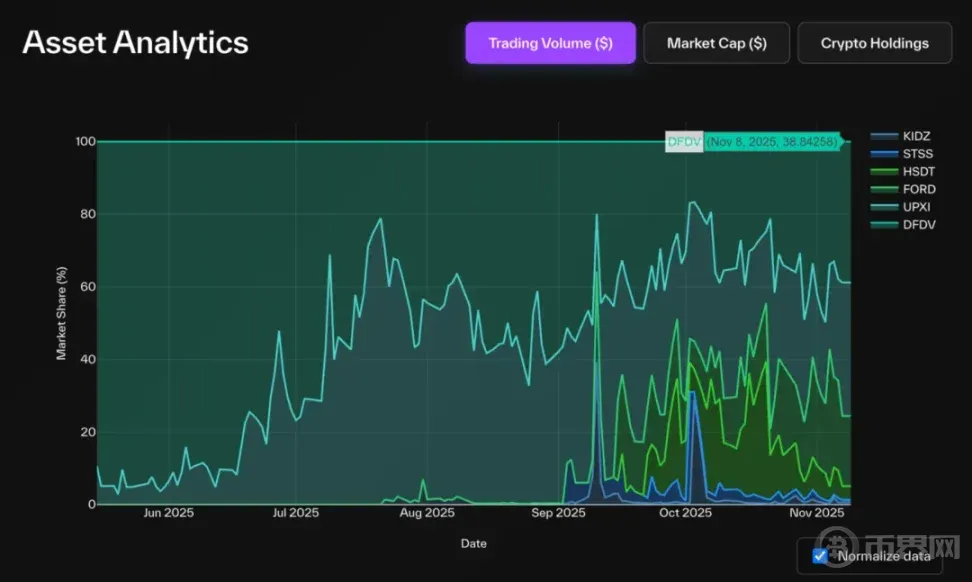市场份额 ( 按 NAV、市值或交易量 ):衡量各数字资产不同 DAT 相对主导地位。由于各 DAT 股票代表不同资产底层价值,比较原始交易量可能产生误导,换手率 ( 交易量 / 市值 ) 更准确衡量流动性和活跃度。
