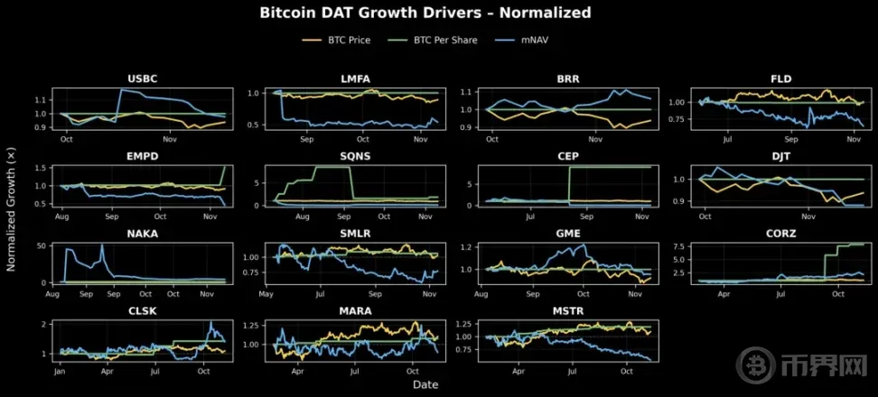 下图显示,几家 DAT 公司——HSDT、BMNR、BTBT、BTCS、CORZ 和 CEP——的基本面价值稳步提升,但由于市场环境变化,其股价未能充分体现。自成立以来,这些公司基本面指标显著增长,即便整体市场情绪有所萎缩。