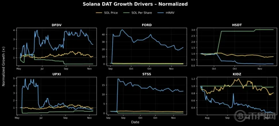 SOL DAT:HSDT 的每股 SOL 增长最显著,从 10 月到报告发布时增长 3 倍;UPXI 也稳步增长,但规模较小。DFDV 受益于市场情绪上升,但同期其每股 SOL 有所下降,表明上涨更多受市场情绪而非基本面驱动。与此同时,FORD 和 STSS 的 mNAV 均大幅扩张,但基本面价值增长基本持平,表明业绩表现受市场情绪驱动,而非资产负债表驱动。