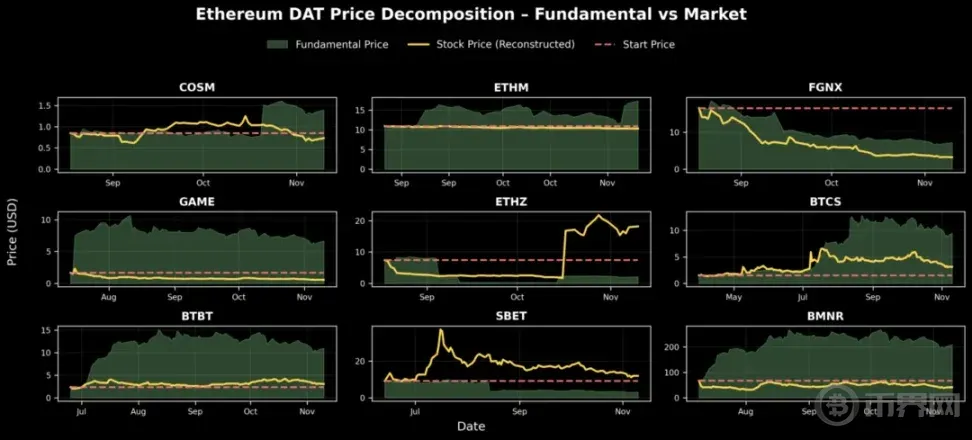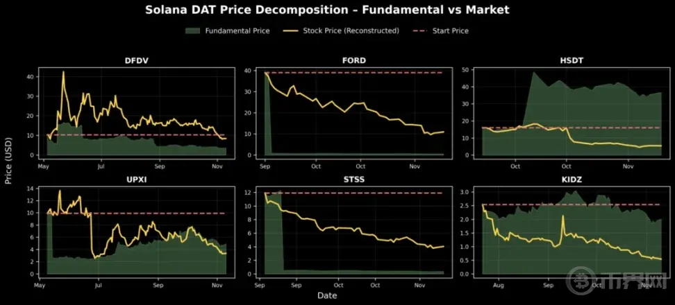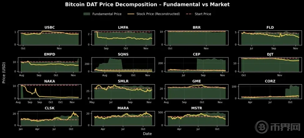 如上图所示,大多数 DAT 公司自推出以来都经历市场降温或收缩阶段。为理解其潜在发展轨迹,我们可以进一步重构每家公司的理论基本面价格——本质上是回答:「如果市场状况与 DAT 推出之日相同,那么今天的股价会是多少?」