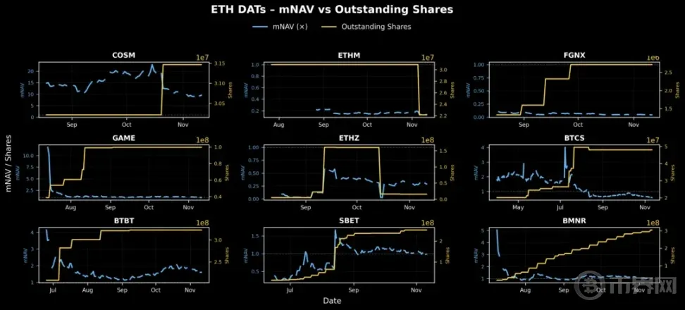 从上图可以看出,ETH DATs 在股权发行和市场情绪管理方面存在明显差异。大多数公司呈现流通股数量逐步增加趋势——表明可能进行 PIPE 或 ATM 发行。