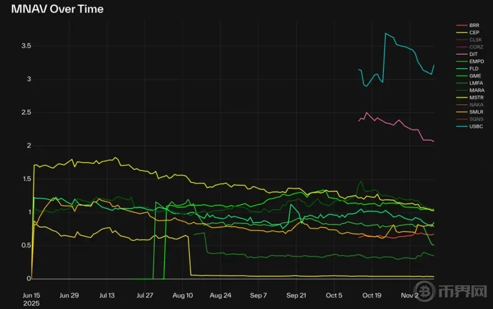 mNAV < 1 → 反映市场的怀疑态度。投资者可能担心股权稀释、质疑管理层的纪律性,或认为公司的数字资产敞口未能有效地转化为股东价值。