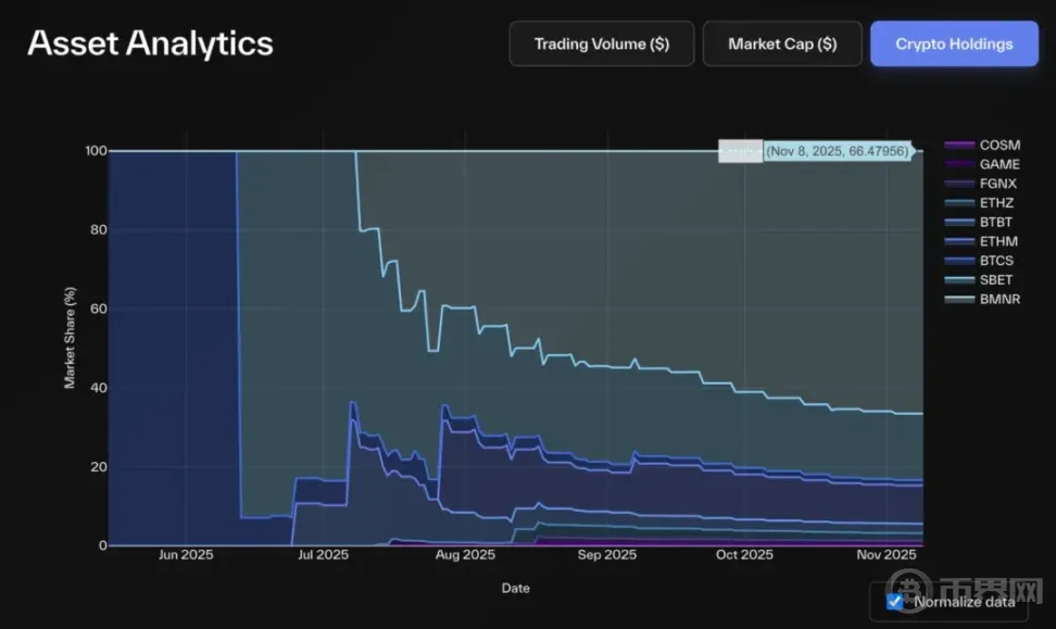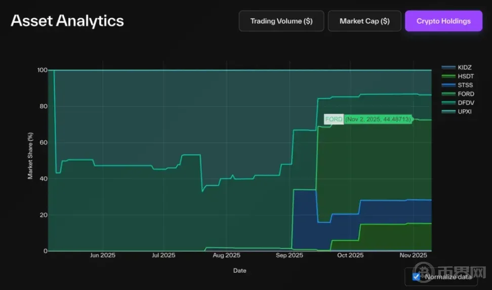 资产供给占比 %:DAT 持有代币占总供给量比例,反映其在底层生态的系统性影响。
