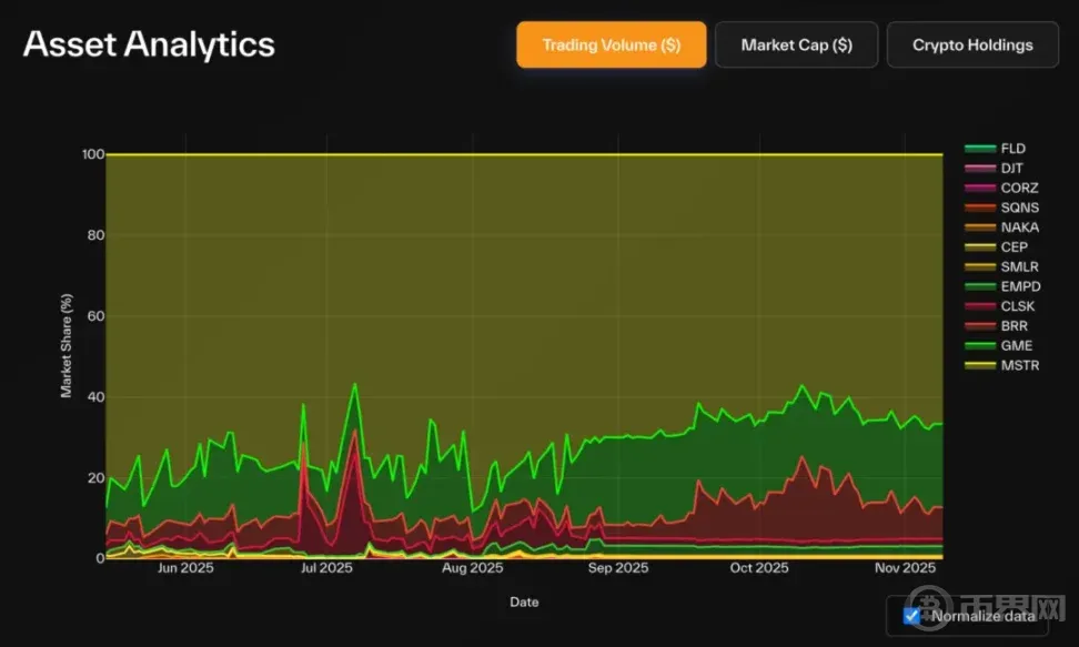 BTC DAT 中,Strategy 主导地位显著:持有 83.3% 的 BTC DAT 总持仓(占 BTC 总供应量 3.22%),占据类别内 72% 市值。GME、BRR 成交额份额增长明显,反映散户活跃度提升。