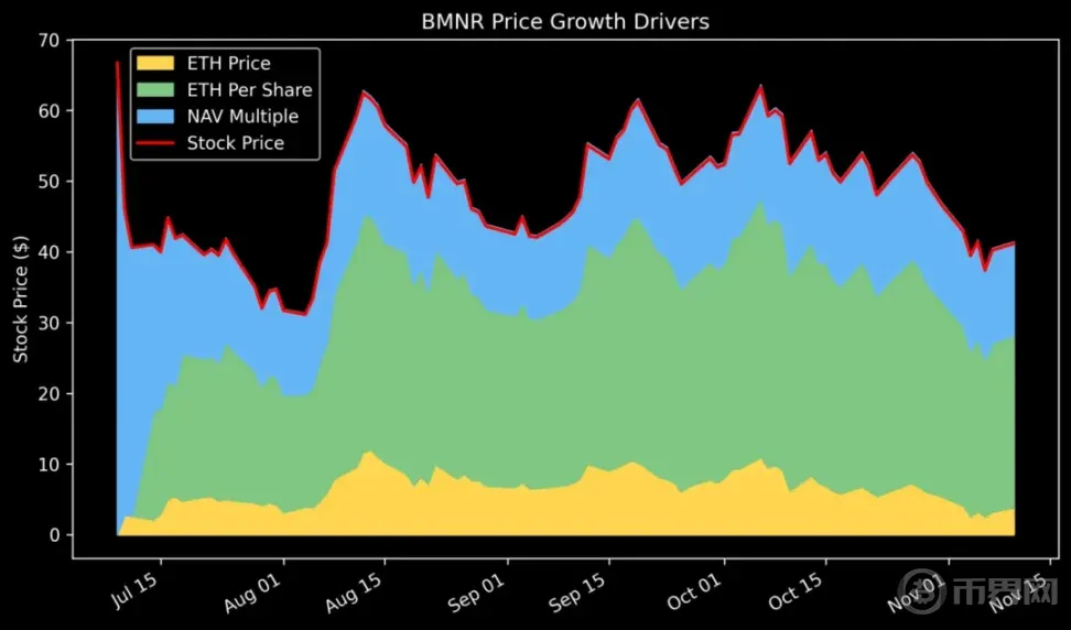 当我们对 Bitmine (BMNR) 的价格增长进行分解时,发现自上线以来,每股 ETH 稳步上涨,而 mNAV ( 情绪倍数 ) 大幅收缩。这表明其基本面依然强劲,只有市场炒作层有所降温。