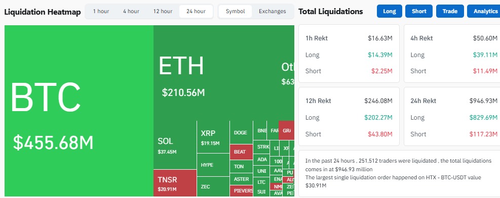全部的加密货币清算交易额突破 9.46 亿美元,创数周以来新高。单笔最大清算金额为 3091 万美元,涉及 HTX 交易所的 BTC-USDT 交易对。